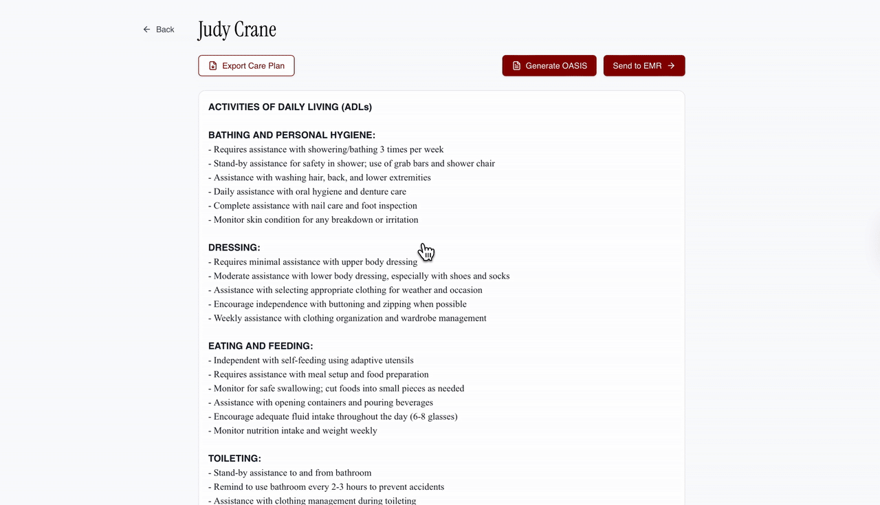 Nara generates a cited OASIS from visit recordings and clinical documents. Once approved, Nara enters it into your EMR for IQIES submission.